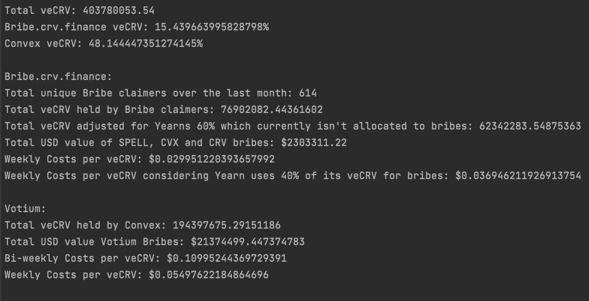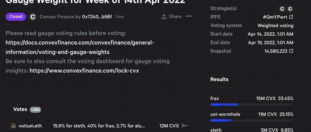 虽然4Pool的四个发起方目前共计掌握约6.9M个CVX代币,占据了DAO掌握的CVX代币总量的50.3%,因此Terra的创始人在Twitter上也以其控制了50%的声明宣告了CurveWar的结束,但是事实是其只掌控了vlCVX总量的15%。因此为了占据Convex的控制权,Terra和Frax选择通过Votium平台去贿赂CVX的持有者,但是也需要为此付出巨额的资金成本。