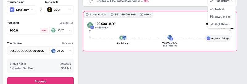 跨链聚合器聚合了跨链桥,连接了DEX和DEX聚合器,缩短了查询所需代币交换路径的时间,用户可以选用任何方式进行整个资产交换过程。对用户来说,跨链聚合器在使用感、便捷性、资金效率等这些标准上都有了较大的提升。可将所有跨链桥、DEX和DEX聚合器聚合在一起,并找到所有可用的路线,然后根据目的地链上的最大输出、交易和转账的最低Gas费用、最低桥接时间等因素,帮助用户以最优途径在不同的区块链之间移动资金。