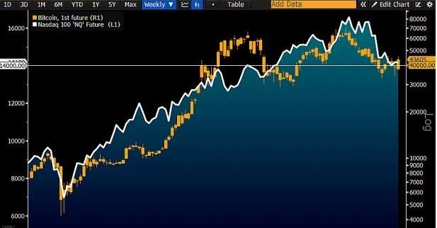 从历史数据来看,股市表现通常不会好于加密货币,BloombergIntelligence分析,比特币可能会稳固在40,000美元区间,而纳斯达克100指数也许会进一步下跌。