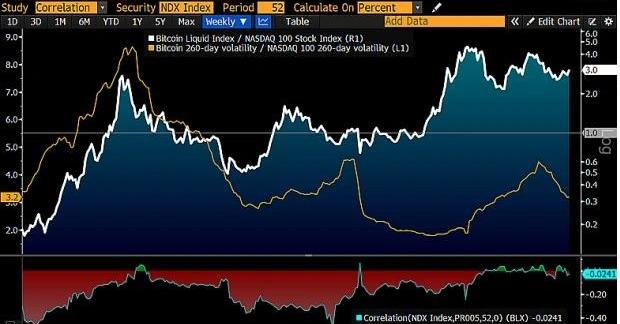 BloombergIntelligence发现比特币出现了两个关键趋势:一个是表现好于纳斯达克100指数,另一个则是相对波动性出现下降。数据显示,比特币相对波动率目前大约是纳斯达克100指数260天波动率的3倍,而在2017年12月比特币期货推出时,这一数字是9倍。
