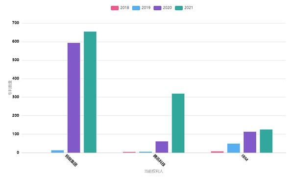前三名持有人分别是蚂蚁集团1252件专利、腾讯科技391件专利、IBM 297件专利。TOP3企业2016年至2021年全球区块链有效发明授权专利分布图: