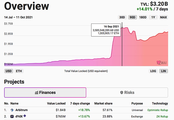 可以说,Arbitrum是基于Optimistic Rollup原理的Layer2项目中发展最好的。自8月31日Arbitrum宣布主网测试版本Arbitrum One上线后,圈内资源一股脑的涌入,市场炒作热情高涨,锁仓量持续升温,一度引爆加密圈对其关注,作为可行的过渡解决方案更为窘迫的以太坊注入了强大的吸金力,上线第二天,Arbitrum主网锁仓量即突破 2000 万美元,9月10日突破亿次关口,目前有18.4亿美金,增长近20倍。据L2BEAT的数据显示,目前,Layer2网络总锁仓量32亿美金,Arbitrum占比达到57%,经历了飞速上涨的Arbitrum目前增长势头不减,持续领跑Layer2赛道项目锁仓量。