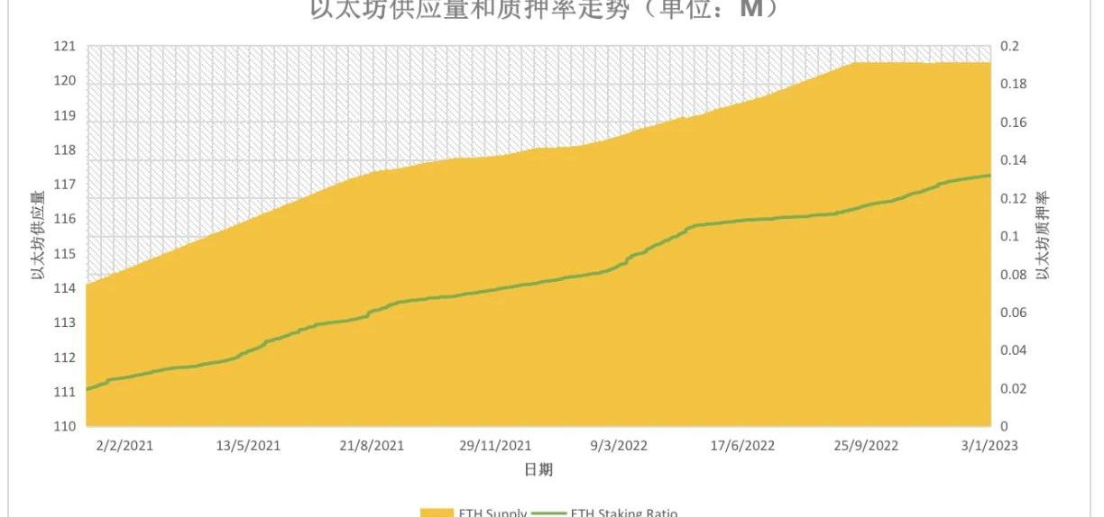 2021年2月至2023年3月间以太坊供应量和质押率走势如上图所示,可以看出自2022年9月开始,以太坊的供应量增长趋于平缓甚至有下降趋势,自以太坊开放质押以来,以太坊质押量不断上升,并且在目前看来以太坊质押量的上升趋势并没有减缓。基于此,我们认为:在市场交易不够活跃的熊市中,以太坊供应量增长逐渐平缓并有下降趋势,可以预计到,牛市的到来,交易量的大幅上涨,消耗gas费的提高,会进一步加快以太坊的通缩。而以太坊质押率会在供应量通缩的背景下走高,然而随着以太坊的质押率不断提高,单个节点的质押收益率随之降低,在以太坊质押率达到一定值时会进入两者间的动态平衡状态。但我们相信,随着区块链行业的不断发展,流动性质押作为DeFi乐高组件,在其上构建、衍生出更多玩法,相应的以太坊质押率也会比预期更高。根据模型测算,以太坊质押量达到44.3M时,质押收益率会降为2.5%;但是,LSD会带来很多新的玩法包括循环贷、套娃等,因此,随着LSD赛道和区块链行业的发展,更具有吸引力的综合质押收益率将会推动以太坊质押赛道走向更高的动态平衡。参考资料:BraceYourselves,ShanghaiIsComingPartialwithdrawalsaftertheShanghaiforkTheFutureofETHLiquidStaking