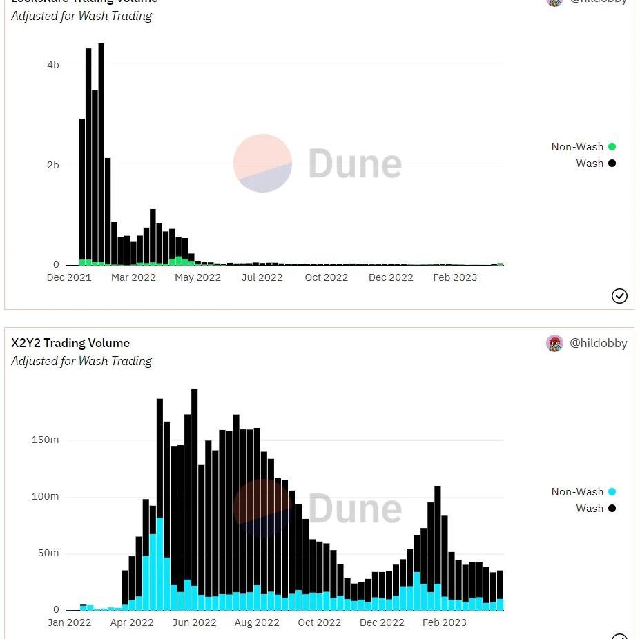 数据来源:https://dune.com/sealaunch/NFT?undefined=&Select+Timeframe_ef4aff=365+days交易挖矿的核心逻辑并不复杂,即每笔交易所付出的平台费用的100%被Token质押者所捕获。一般而言,团队/基金会或者国库都会保留部分Token,用于质押分享捕获的平台费用,从而作为支持协议的发展资金。理论上,平台创造的交易量越大,用户质押的Token越多,吸收的平台费用就越大,捕获的费用奖励就越多。因此,交易挖矿在从0到1的开展初期容易形成正向的驱动,获取空投进行交易,交易量增长带来平台费用增长,平台费用被质押者捕获,质押收益APY增长,Token价格上涨,交易挖矿的潜在奖励价值上升,吸引更多的用户来进行交易挖矿。但伴随着大环境的萧条,竞争对手的出现,市场份额的改变,Token减产等多重因素,这套交易挖矿的模式很容易反过来为Token带来负面螺旋。交易挖矿的wash-trade不像Blur那样复杂,大多是大户在自己控制的几个钱包中来回对倒。只要补贴的Token能覆盖住预先付出的平台费用,那么就是有利可图的。而且补贴以每天结算的方式到账,在领到Token后几乎不会有过多的忠诚度,拿到即抛售先挽回付出的成本,再去衡量把利润继续抛售还是质押复投。@hildobby_数据面板显示,在上周一周的交易量中,LooksRare累积交易量为$47,903,449,wash-trade占比45.6%;X2Y2累积交易量为$36,039,982,wash-trade占比69.6%。这种基于wash-trade的交易挖矿活动在熊市的低迷需求中为平台Token带来持续的抛压,LOOKS和X2Y2在过去很长一段时间以来都表现得一言难尽,特别对于缺乏做市商的X2Y2更是灾难。