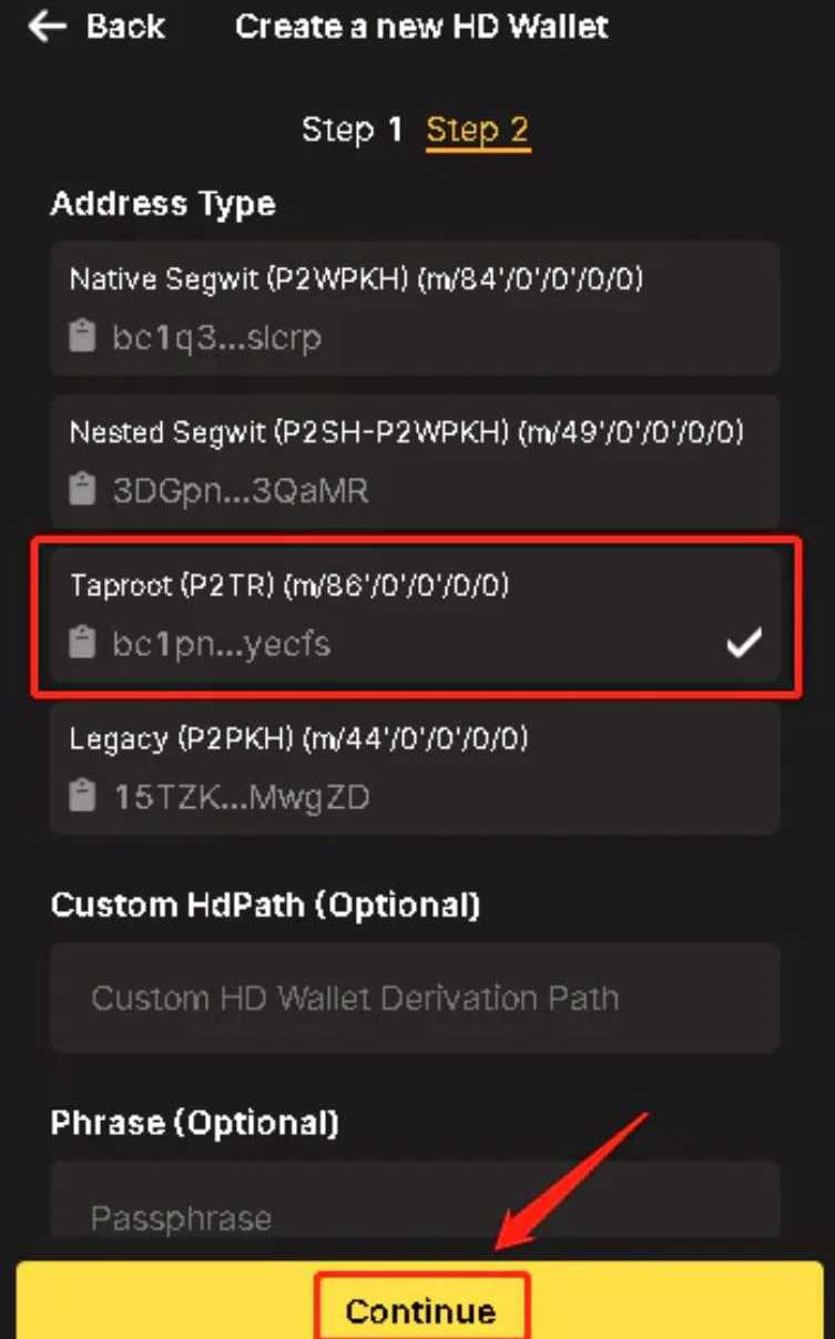 推荐UniSat(开源插件Ordinals钱包),目前业内最便捷的一款,国货之光。创建钱包,备份助记词,选择地址的时候,选择后面为m/86/0/0/0,然后确认。