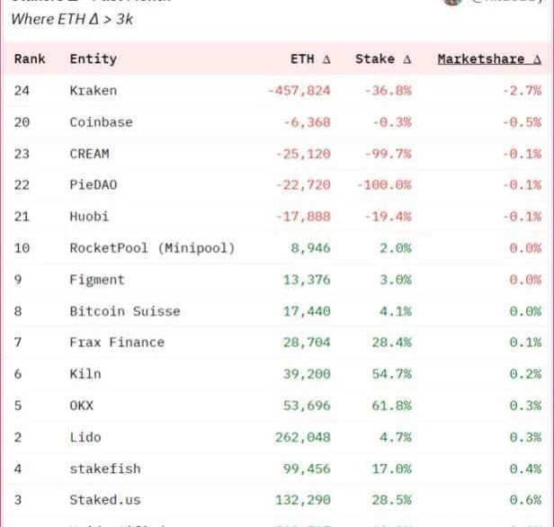这正是正在发生的事情——在过去的一个月中,Kraken、Coinbase和火币失去了市场份额。实际上,所有ETH质押提款的36%都来自Kraken。