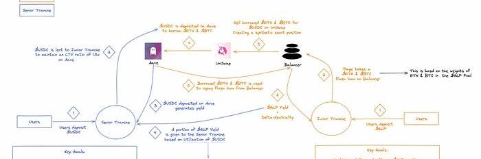 在与RageTrade创始人@crypto_noodles进行短暂的讨论后,我们了解到该协议旨在做两件事:1)为GMXLP提供预打包的Delta中性策略,2)为稳定币存款人提供更多的收益。RageTrade的愿景是通过利用真实和可持续的GLP收益成为Arbitrum最大的稳定币农场。为了实现这一目标,RageTrade计划提供两种产品,分别是JuniorTranche和SeniorTranche。下面的简单工作流程描述了RageTrade的金库将如何工作。