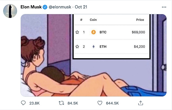 10月21日,特斯拉创始人埃隆·马斯克(Elon Musk)在推特上晒出了一张图片,一个男人把头埋在女人怀中,看不到表情。此时墙壁挂着的荧幕上赫然写着BTC 69000美元、ETH 4200美元。马斯克没有给图片配上任何文字,似乎想任由看客体会其中深意。