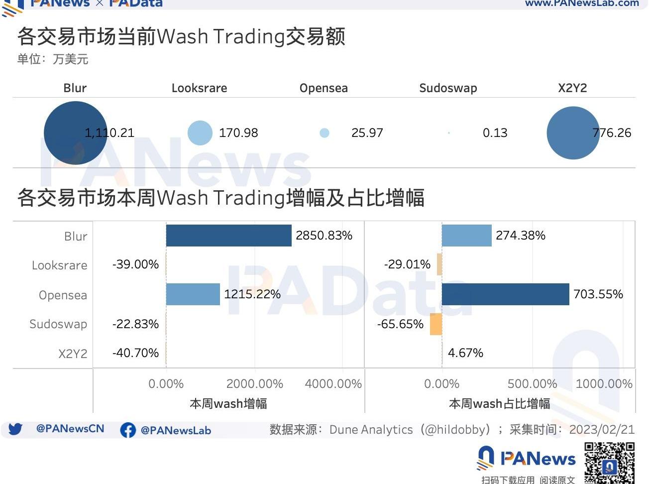 不过,需要指出的是,各个交易市场的交易量也不全是健康的,在最近的增量中,不健康交易量也所有增长。尤其是Blur,最近一周不健康的交易量激增2851%,不健康交易量占比增长了274%,当前不健康交易量为5个观察市场中最高的,约为1110万美元。不过,有趣的是,最大的竞争对手Opensea最近一周不健康的交易量也增幅明显,达到1215%,不健康交易量占比增长了704%。