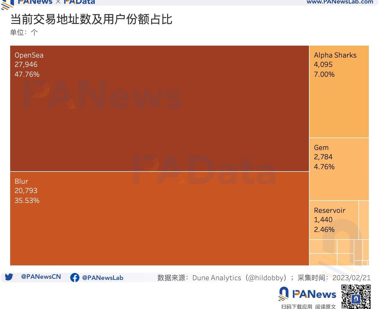 目前(02/20),Blur的日交易地址数约为2.08万个,占15个交易市场总交易地址数的35.53%,居第二位。用户规模最大的仍然是Opensea,日交易地址数为2.79万ETH,占总交易地址数的47.76%。如果把交易地址数量理解为用户规模,那么从用户份额来看,两者的占有率合计达到83.29%。剩下的交易市场中,用户份额超过5%的也只有Gem和AlphaSharks,其他大多不足0.5%。