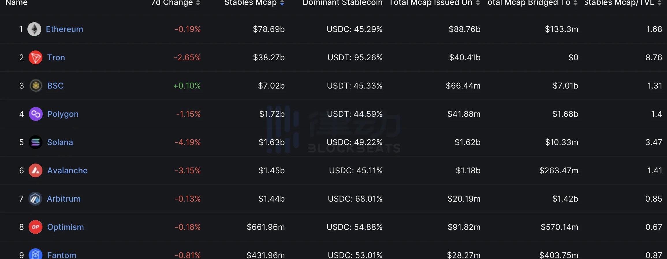 而目前UniswapV3上TVL最高的流动性池同样为USDC兑DAI的0.01%和0.05%池,TVL约4亿美元,其次才是USDC兑ETH的流动性池。0.3%加0.05%两个池,TVL约3.35亿美元,其中,两个池内目前共有约11万枚ETH,价值约1.6亿。从整个以太坊主网看,目前TVL为260亿,对稳定币市值的占比也是各公链中最小的。