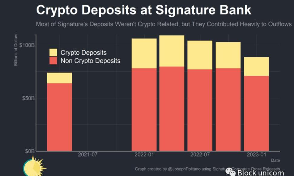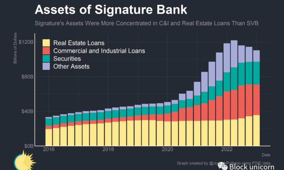尽管签名银行的失败并未受到足够的关注,但它仍是美国历史上第三大破产案例。那么,究竟是什么导致了这家纽约顶级加密银行的破产呢?在3月12日,美国监管机构采取行动,阻止了美国银行体系中正在酝酿的危机。他们决定让已经破产的硅谷银行的存款人得到全额赔付,同时宣布关闭总部位于纽约的签名银行,并让其存款人得到全额赔付。与硅谷银行相比,签名银行规模较小,而且很快被星标银行收购,这意味着该机构的失败并没有引起太多关注。但签名银行的崩溃本身值得分析——如果没有SVB,它本将成为美国历史上第二大破产银行,甚至比1984年的大陆伊利诺伊银行破产还要大。此外,签名银行与SVB并非完全具有相同的潜在问题——尽管两家银行都有集中的存款人基础、大量无保险存款,并在最近几个季度出现了巨大损失和存款外流,但签名银行并未像SVB那样对长期资产进行大量无避险投注,导致利率上升时受到打压。相反,它在纽约商业房地产和私募股权借贷市场上有更集中的敞口,并在加密行业中担任关键角色,这使得它在当前市场环境中比大多数银行更弱,但比SVB更强。这意味着签名银行在危机爆发时比SVB处于更好的立足点——但这仍然无法挽救它。两家金融机构最终都以相同的方式走向灭亡——来自无保险存款人的大量提款,最终使得银行无法生存。不仅仅是一个加密银行
