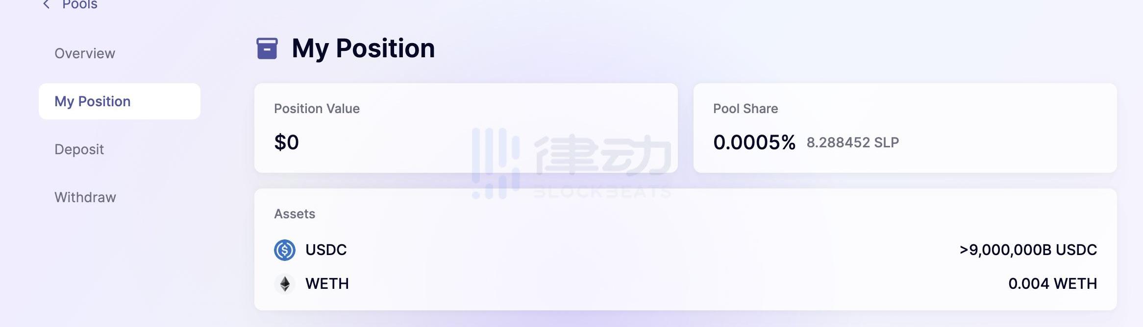点击Deposit存入ETH与USDC,添加流动性。BLockBeats注:首次使用该功能需要授权解锁USDC然后才可以进行Deposit。