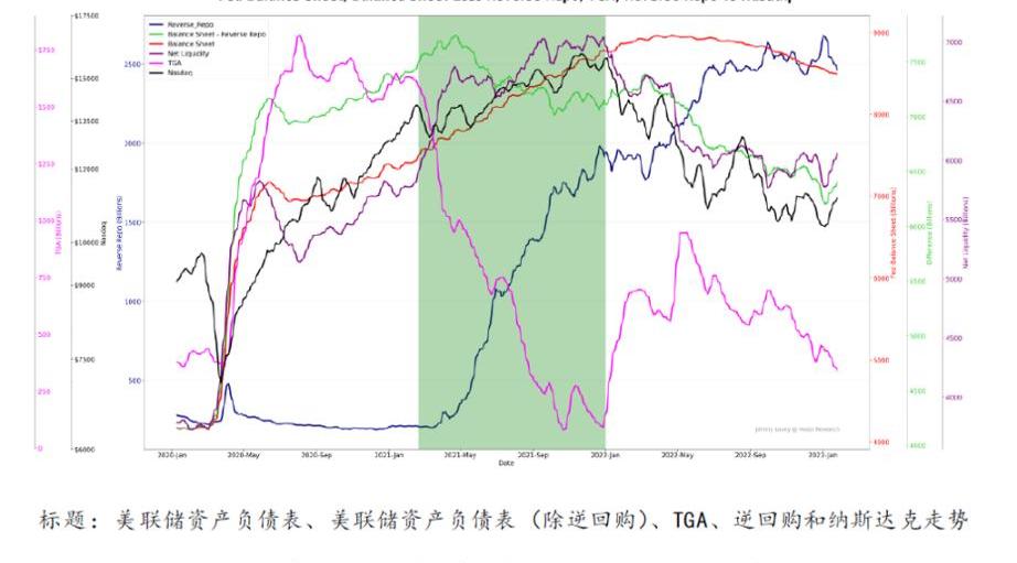 红色阴影部分是逆回购需求猛涨的时间段。在此时间段内,热钱更风险厌恶,而对风险资产偏好度降低。“量化紧缩在2022年1月已经悄然开始”,这个表达其实也恰如其分地捕捉到了在2021年12月美国财政部一般账户余额达到最低点。美国财政一般帐户余额的增长意味着准备金的降低,而银行准备金的降低会对经济活动产生致命影响,尤其是市场对风险资产的参与度。驱动因素会在第二章详述。第二章剖析美联储资产负债表及流动性驱动因素