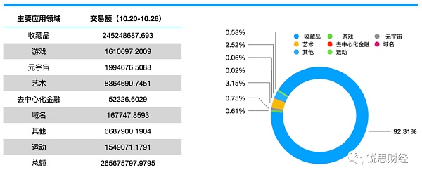 根据?Oklink?在 2021 年 10?月 20?日至 10 月 26?日的统计来看,收藏品类 NFT?交易最为活跃,7 日交易额超过 2.4?亿美元,占总额的比例高达 92.31%,其中 CryptoPunk 项目交易额位居第一。