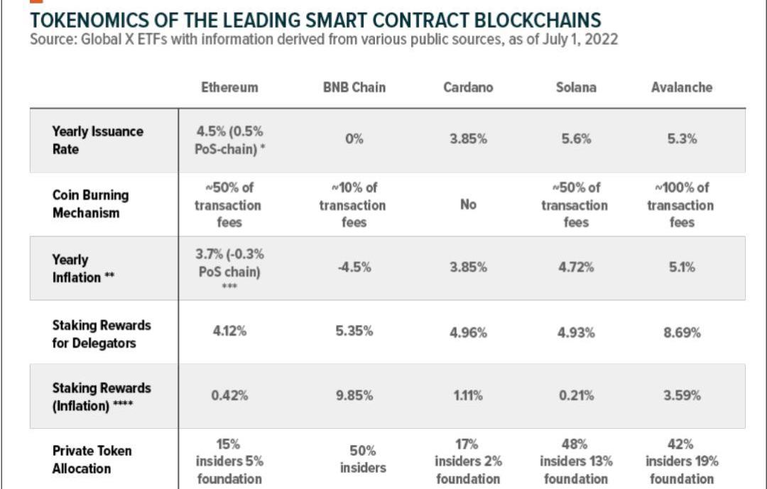 图5:ETH年度发行量变化ETH发行量的变化相当于三个以上的BTC减半。假设以太坊生态系统在未来发展,交易费数量增加带来的ETH销毁可能超过发行量,有可能导致ETH成为一种通缩资产。跟踪以太坊协议即将发生的变化,并了解这些变化对总供应量的影响,对任何潜在的投资者来说都是至关重要的。与大多数支付加密资产在供应动态方面没有发生重大变化不同,由于在更复杂的基础设施上工作,SCP似乎对其代码库进行了更多重大更改。因此,某些结构性动态如供应偶尔会发生剧烈变化。作为一个投资者,了解供应动态的巨大变化的二阶效应是很重要的。例如,在Token通胀大幅下降后,想象一个场景,人们认为以太坊的内在价值是相对稳定的。鉴于每年来自miner的约450万ETH的抛售压力减少到零,并假设市场价格在短期内保持相对稳定,人们可以提出这样的问题。"如果一年没有450万ETH的抛压,如果需求保持不变,价格会发生什么?""如果需求不变,但ETH变得通缩,价格会怎样?"如果投资者认为市场还没有对较低的Token通胀率的全部影响进行定价,他们认为影响是看涨的,他们可以买入该资产。虽然前面两个变化代表了供需动态最明显的变化,但并不全面。其他可能影响这些动态的变化包括。1、货币政策的变化:如果以太坊网络改变其创造新ETH的方式,这极有可能会影响ETH的供应,从而影响其价格。随着越来越多的人和组织希望使用以太坊,这可能会增加对ETH网络的需求。2、用例的变化:如果以太坊代码库被修改,扩大了可以在该平台上建立的应用程序的范围,这可能会增加对ETH的需求,因为更多的人和组织希望使用以太坊网络。3、对网络可扩展性的变化:如果以提高网络可扩展性的方式修改以太坊代码库,这可能会增加对ETH的需求,因为更多的人和组织能够使用用于decentralized应用程序的以太坊网络Token分配在了解供应动态时,也应考虑原生Token分配和解锁期。对于大多数SCP来说,创始团队通常将一部分Token分配给他们自己和其他内部人员,以资助项目的初期阶段。这些Token通常在若干年内释放完毕,但不同的团队有很大差异。如果出于长期考虑而想要购买某种Token,那么在等待期之后进入Token头寸可能被证明是对投资者有利的切入点。下表概述了各种SCP的私有Token分配和经济模型。