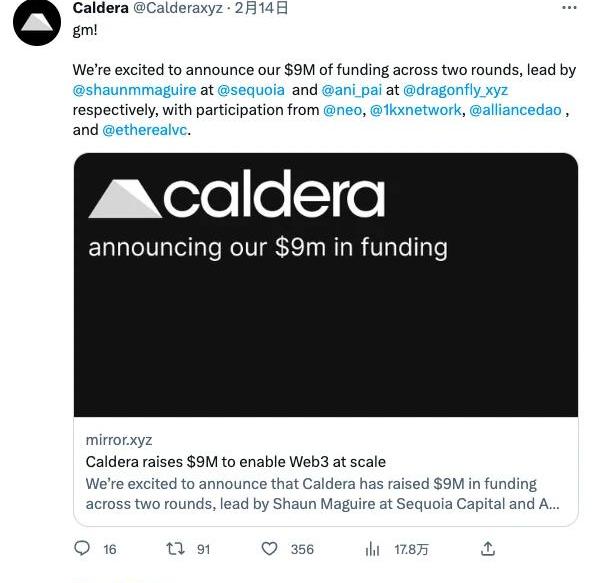 2月14日,App-Rollup扩容解决方案项目Caldera宣布在两轮融资中合计筹资900万美元,两轮融资分别由红杉资本和DragonflyCapital领投,Neo、1kx和EtherealVentures,以及其他天使投资人参投。