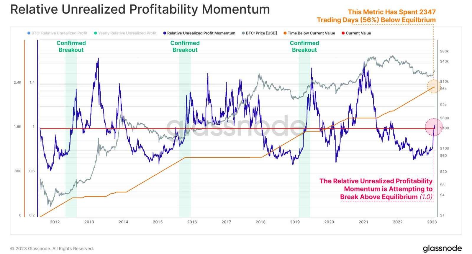 LiveAdvancedWorkbench市场持有的未实现利润总额与其年平均值之间的比率,可以为复苏的市场提供一个宏观指标。最近价格走势的飙升,已经超过了几个聚合的链上成本基础模型,导致市场财务状况显着改善。这一动量指标目前正接近均衡转折点,与2015年和2018年熊市的复苏情况相似。从历史上看,突破该平衡点的确认突破与宏观市场结构的转变同时发生。我们还注意到,在主要熊市中,低于这一平衡点的时间长度是相似的。
