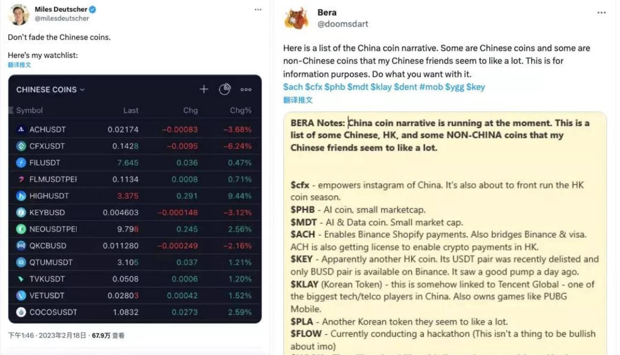 上周比特币突破2.5万美元,再次助长了市场的FOMO情绪。继AI、元宇宙概念之后,一个全新概念板块在这两天成为焦点:ChineseCoin。中概币板块的诞生,主要受两方面因素影响:一是以美国证券交易委员会为首的美国监管机构,对美国头部加密企业Kraken以及Paxos展开调查——Kraken目前已经和解并支付罚款,似乎有意对加密产业收紧监管的口子,因此被戏称为「美版九四」。二是港府曾计划在3月实施虚拟资产服务发牌制度,最新消息是6月执行;近期更是有传言称「6月1日起香港居民自由买卖加密货币将完全合法」,虽然最终辟谣,但在政策利好预期前景的刺激下,投资者依然对加密后市抱以极大的信心。东西方截然相反的两种态度,也让全球加密投资者对中国加密企业的关注度上升。特别是在国产公链Conflux与中国央企合作后,Token价格飙升,过去一周涨幅接近400%,起到了良好地「示范」作用。一时之间,海外投资者对中国项目FOMO情绪骤增,一些海外社交媒体大V更是开创了「ChineseCoin」作为一个全新板块。2月18日,在社交媒体拥有29.3万粉丝的加密KOL「MilesDeutscher」发文晒出了自己总结的「ChineseCoin」概念列表,囊括CFX、FIL等12个代币。另外一位KOL「Bera」继续拓展了该列表,将币种数量增加至17个——“有些是「中概币」,有些是我的中国朋友很喜欢的非中概币。”