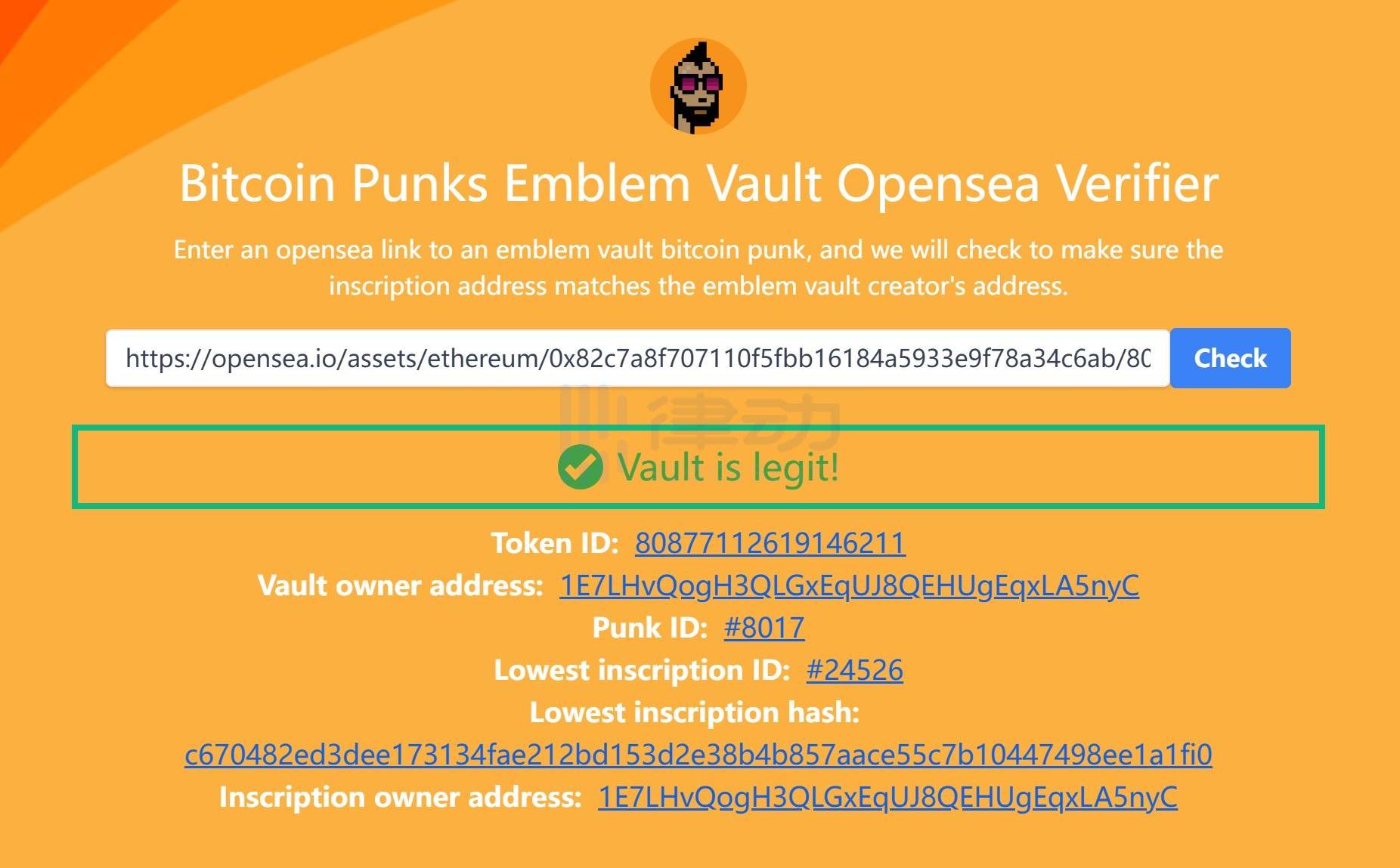 上图显示,当前该真Punk的存放地址为bc1puur...,而Vault指定的存放地址是15ub...,二者不一致,前文OpenSea上的标的鉴定为假。针对BitcoinPunks系列,有热心网友开发了一款快速筛查工具,只要输入OpenSea链接进行查询即可辨别真伪。其他比特币NFT系列暂时只能根据上述步骤手动进行筛查。