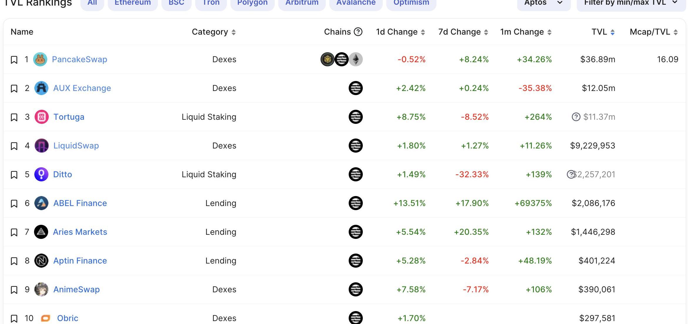 DEX和抵押借贷项目是吸引跨链资金最多的应用,根据DefiLlama2月2日的数据,Aptos上的TVL共6334万美元,相对于Aptos的总市值或流通市值而言都比较低。现阶段的数据只能反应哪些项目在主网上线的这三个月里抢占了先机,而不能代表最终结果。在Aptos的这些应用中,资金量超过300万美元的项目包括PancakeSwap、AUXExchange、Tortuga、LiquidSwap、Ditto,其中Tortuga和Ditto为流动性质押项目,合约中的资金仅包括APT代币,不会使用到跨链桥。下面的分析只包含了PancakeSwap、AUXExchange和LiquidSwap,也忽略了资金量较小的项目。