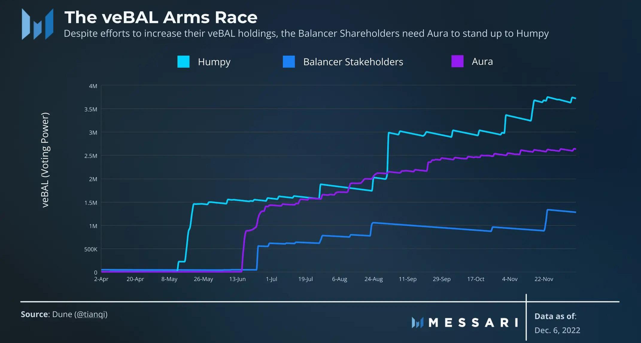 Balancer引入了投票托管代币经济学,使代币持有者与协议的成功和收入保持一致。虽然veBAL实验吸引了合作伙伴,但它也吸引了一头称为Humpy的鲸鱼,该鲸鱼积累了35%的veBAL控制权。在过去的八个月里,Balancer一直在努力通过激励措施使Humpy的活动与DAO的目标保持一致,而不是陷入猫捉老鼠的游戏,通过治理来控制鲸鱼的逐利活动。由于在80BAL/20WETH/tetuBALBalancer池中头寸处于非流动性状态,Humpy选择加倍保护他们的挖矿策略不受Balancer治理的影响,结果导致Balancer生态系统的冲突升级。最近的一项和平条约旨在达成一项君子协定并缓和冲突,允许Humpy继续以17.5%的规模限制他们最激进的挖矿规模策略,以换取Humpy在所有其他位置与DAO策略保持一致。简介