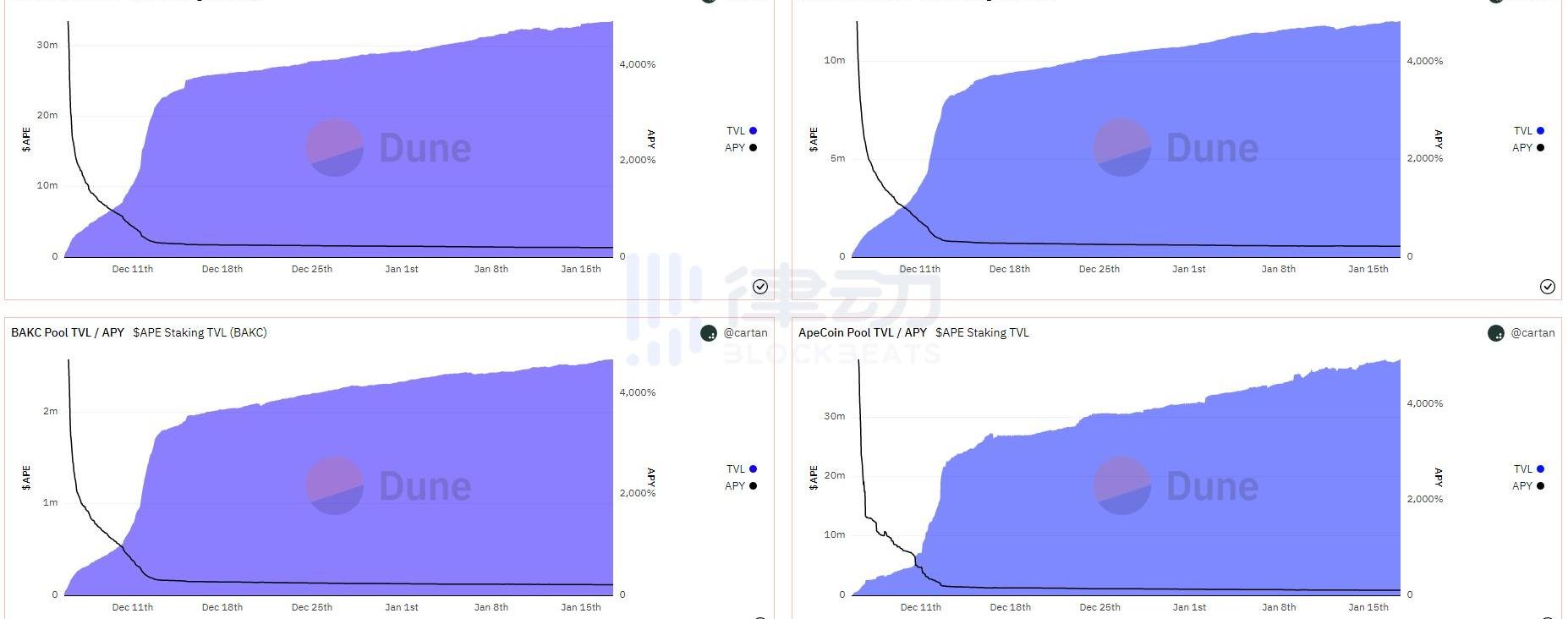 ApeCoin的解锁曲线根据Dune数据显示,ApeStake.io官方四个池子在开启质押挖矿后,APY在一个月时间内从开始时的将近5,000%下降至目前200%左右,都以反比例函数的形式快速下降。ApeCoin的Token解锁会不可避免地增加ApeCoin在市场上的供应量,几乎整个代币经济学沿用了老套的庞氏模型,高APY不可持续,那如何保障各个阶段入场的投资者能安全退出是一个问题。同样的,对BendDAO的Token经济模型也有关于不可持续的质疑声。Blur空投活动结束可能引发连锁反应