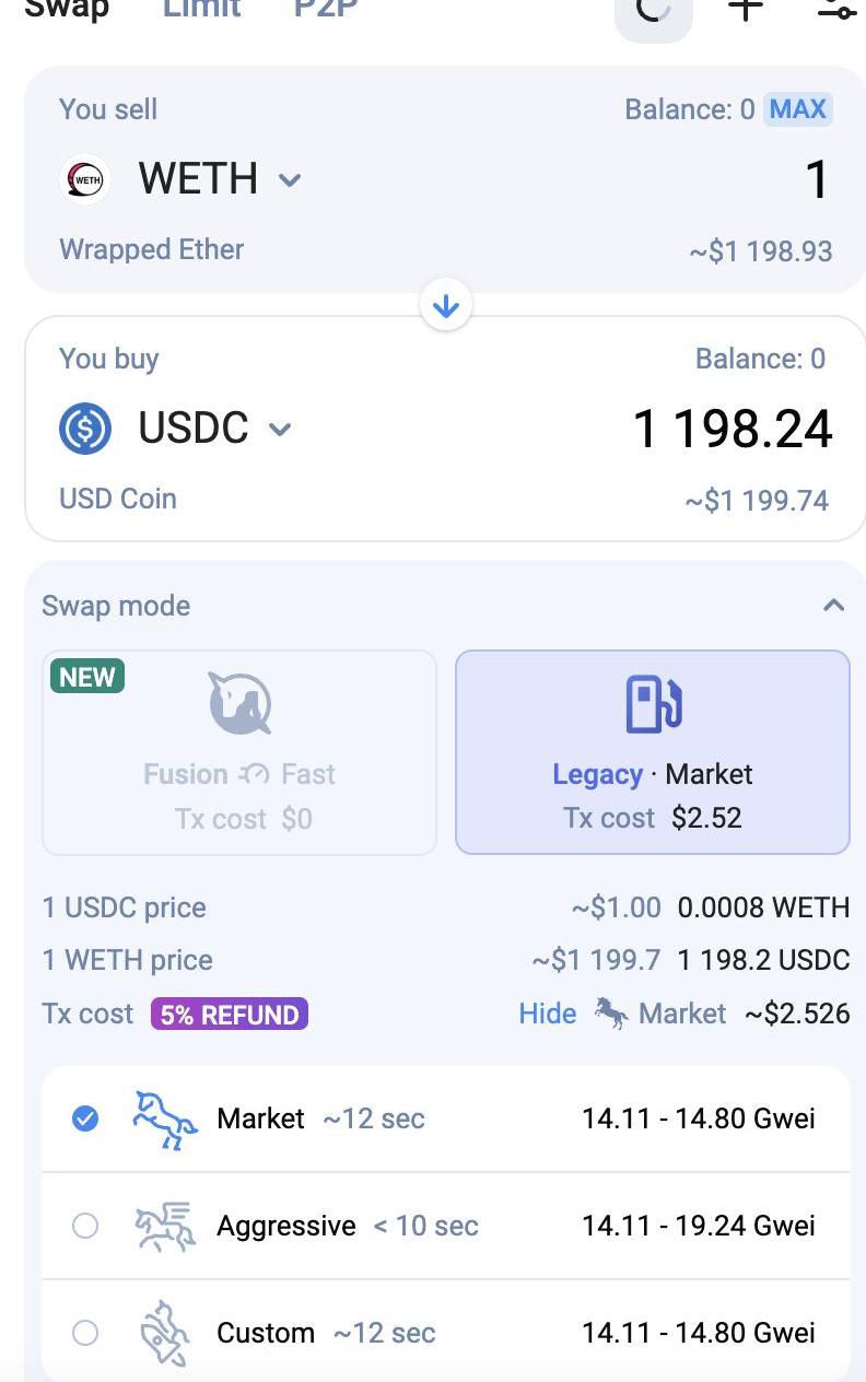 如今1inch中的交易已默认切换至Fusion模式。如下图所示,Fusion模式下快速、公平、拍卖模式下的交易都不需要用户支付Gas费。但是这并不代表Resolvers会义务帮用户支付Gas费。以下图中分别在Fusion和Legacy模式下将1WETH兑换为USDC为例,两者显示得到的代币的市场价值是相同的,均为1198.24USDC。左边的Fusion模式不需要花费Gas费,而原来的Legacy模式下需要花费2.52美元的Gas费。但在市场价格不发生变化的情况,右图中Legacy模式下显示的价值即为实际得到的价值;而在左边Fusion模式下,实际得到的价值需参考下方的Est.received,这个值会在完成帮助用户完成交易后扣除Gas费和其它费用。