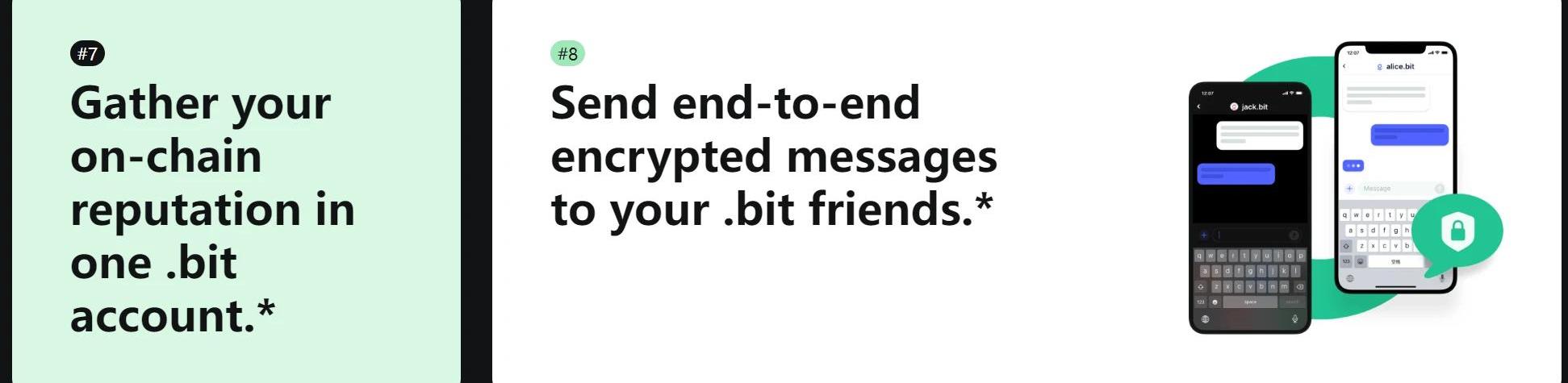 .bit与其他项目最大差异就是跨链。可以说.bit支持任何一种公链地址,这得益于它所依赖的高可扩展性、高抽象层次的NervosCKB网络,因此几乎任何公链无需做任何改造,就能被.bit兼容,目前.bit已跨链支持了Ethereum、Tron、BNBChain、Polygon四种公链的支持,也就是你可以在这四种公链任何一种来注册自己的.bit,你只需保管好你在该公链上的私钥即可.bit未来有计划增加Bitcoin、Dogecoin、Polkadot、Dfinity、Solana、Filecoin、Cardano、NEM、Monero、Flow、NEAR、Litecoin、Nervos、Terra、Celo、Dash、Cosmos等多种常见公链支持.bit不仅支持可运行智能合约的公链,同样也支持像Bitcoin、Dogecoin等这些不支持智能合约的公链,这样的操作是同类产品中很难甚至根本无法做到的.bit账户是通用的,你可以在该账户上解析任何一种公链信息.bit支持Web2上的身份地址以及区块链地址等信息解析,信息解析后您再无需记住您冗长的地址,仅需提供.bit账号,对方即可查看您的所有相关信息.bit不仅是一个DID账户,同时也可以作为一个跨链资产聚合器,拥有.bit账户的同时,也自动拥有.bit.host和.bit.cc,如您拥有了0xfather.bit,您同时也拥有0xfather.bit.host和0xfather.bit.cc这两个域名地址,您将可以通过他们来查看您的公链资产。另外.bit已实现NFT、POAP、.bit账号、公链地址等内容的集成,拥有一个.bit账号,您就相当于拥有了一个跨链跨资源的专属身份名片.