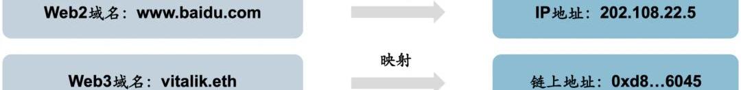 Web3域名,一般指那些后缀为.eth、.bnb、nft、.wallet等公链缩写或有强Web3特征的简称,且应用场景主要在区块链/Web3领域的域名。以太坊的ENS是这一赛道最知名的、最有代表性的项目。域名这个概念,起源于早期的互联网时代。最早的时候,大家都是通过IP地址来直接访问网页的,比如你如果现在在浏览器地址框输入“202.108.22.5”,那么你就可以打开百度的首页,因为202.108.22.5这串数字正是百度的IP地址。但显然,这串数字是不具备可读性、难以记忆的。因此,早期的互联网设计者们就构建了域名系统DNS(DomainNameSystem),通过把www.baidu.com等可读性更强的域名作为“网页地址”,来对数字IP地址进行封装,以便人们日常使用。现在,每个互联网用户都知道“网页地址”这个概念,即使其中大多数人不知道其下的IP地址、DNS等原理,但这完全不妨碍他们在互联网上的体验。Web3域名最直观的价值也是类似的,它是用户的“Web3昵称”,是对链上地址的封装,比如vitalik.eth就是对这个以太坊地址的封装:0xd8da6bf26964af9d7eed9e03e53415d37aa96045每个Web3用户都会持有至少一个链上地址,但恐怕没有人会想着去记住自己的地址,更不用说是记住别人的了。而诸如vitalik.eth、2089.bit、jack.bnb之类的域名,显然比那一长串地址字符更具备可读性和可记忆性,更能满足人们日常生活使用的需求。比如,你需要让你的朋友给你转账,你可能要去钱包或者记事本里找到自己的链上地址、再发给你的朋友;但如果你持有一个域名,比如vincent.eth,你可以直接告诉朋友往这个域名上转账。