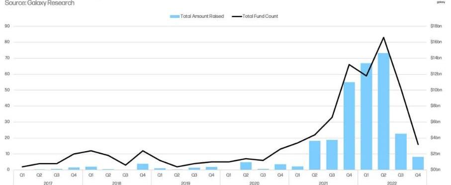 在当前的宏观环境下,因为投资者对投资风险的重新考量或是直接撤资,导致投资机构筹集资金变得很困难,特别是伴随着加密资产价格的下跌和市场的大动荡,进一步加剧了这种困难,2022年Q4季度,无论是加密VC基金的数量还是加密基金筹款总额都创下了近两年来的新低。