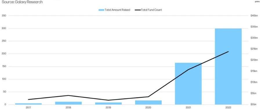 然而,按全年计算,2022年仍然是加密VC筹款规模最大的一年,200多家基金筹集了超过330亿美元的资金,相比2021年140家风险基金筹集的194亿美元,2022年增长非常显著。