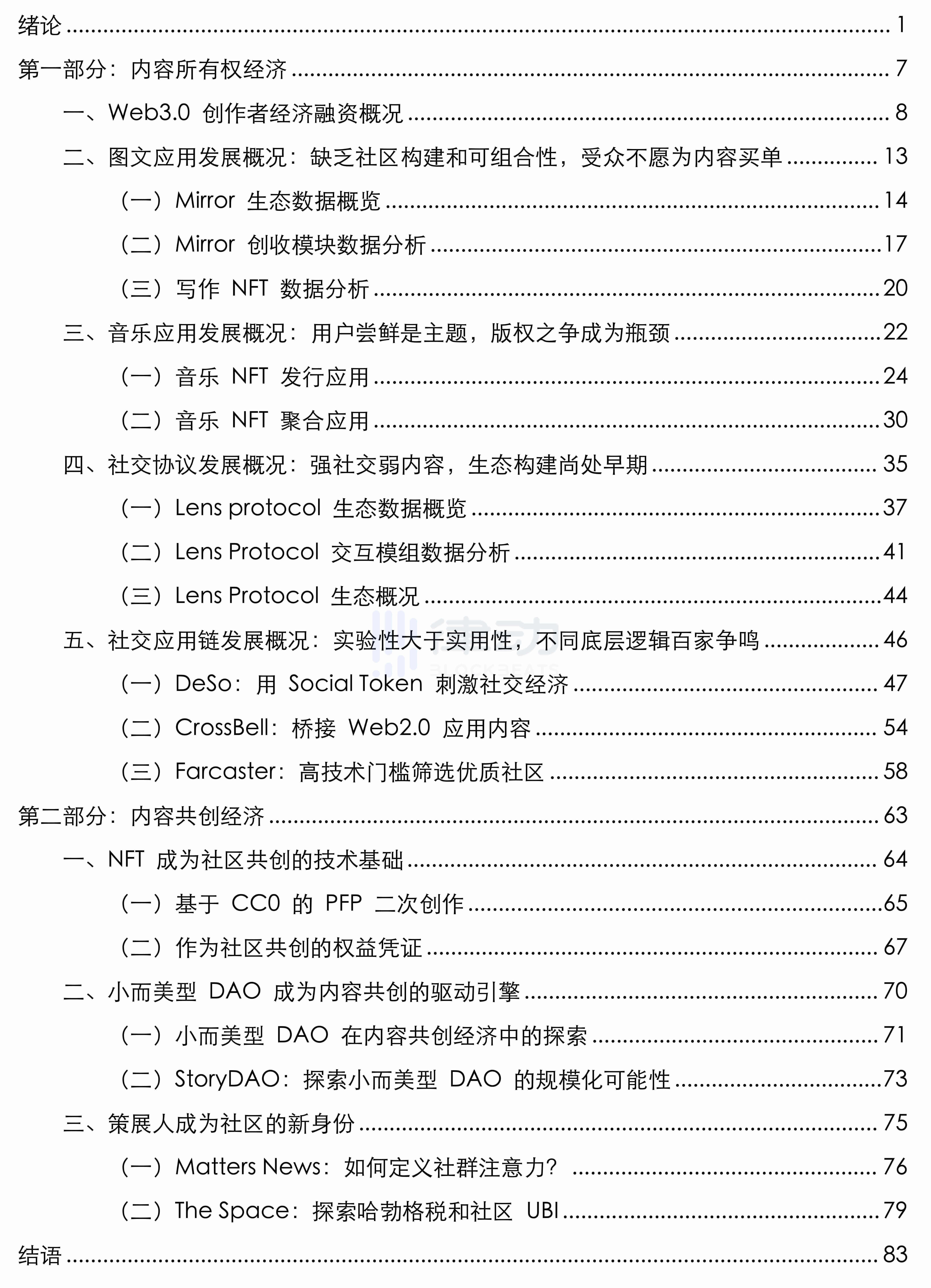 笔者注:经过1个月时间的案例研究、数据分析和深度访谈,以及对Mirror、Lens等40余个Web3.0项目的梳理,我们搭建起了Web3.0创作者经济的完整框架,并就市场目前对SocialFi的模糊界定,重新提出「CreatorFi」这一新的概念。以此为基础,本报告阐明了当前Web3.0创作者经济的发展现状,并对其未来的想象空间做出了展望。「摘要」2021年底,LiJin发表了一篇名为《Web3:创作者经济的黄金时代》的文章,对Web3.0语境下的创作者经济做出了激动人心的设想,随之掀起了一股Web3.0创作者经济浪潮。在区块链的技术支持下,创作者经济的面貌焕然一新,创作者再次获得了内容的所有权,有了更多的变现模式,与受众的关系发生了改变。从LiJin文章发布至今一年多的时间里,Web3.0创作者经济领域诞生了诸多极具意义的实践与探索。但不同于DeFi、NFT等主流加密赛道,当前的Web3.0创作者经济正处于起步阶段,受众范围较小,内容生产匮乏,市场认知模糊,有力竞争者不多,仍然是一片等待开发的蓝海。通过案例和数据分析,BlockBeats深入研究了Web3.0创作者经济的发展现状和问题,以期为创业者们提供更具洞见的创业方向指南。关键词:创作者经济、Web3.0、社区、内容共创目录