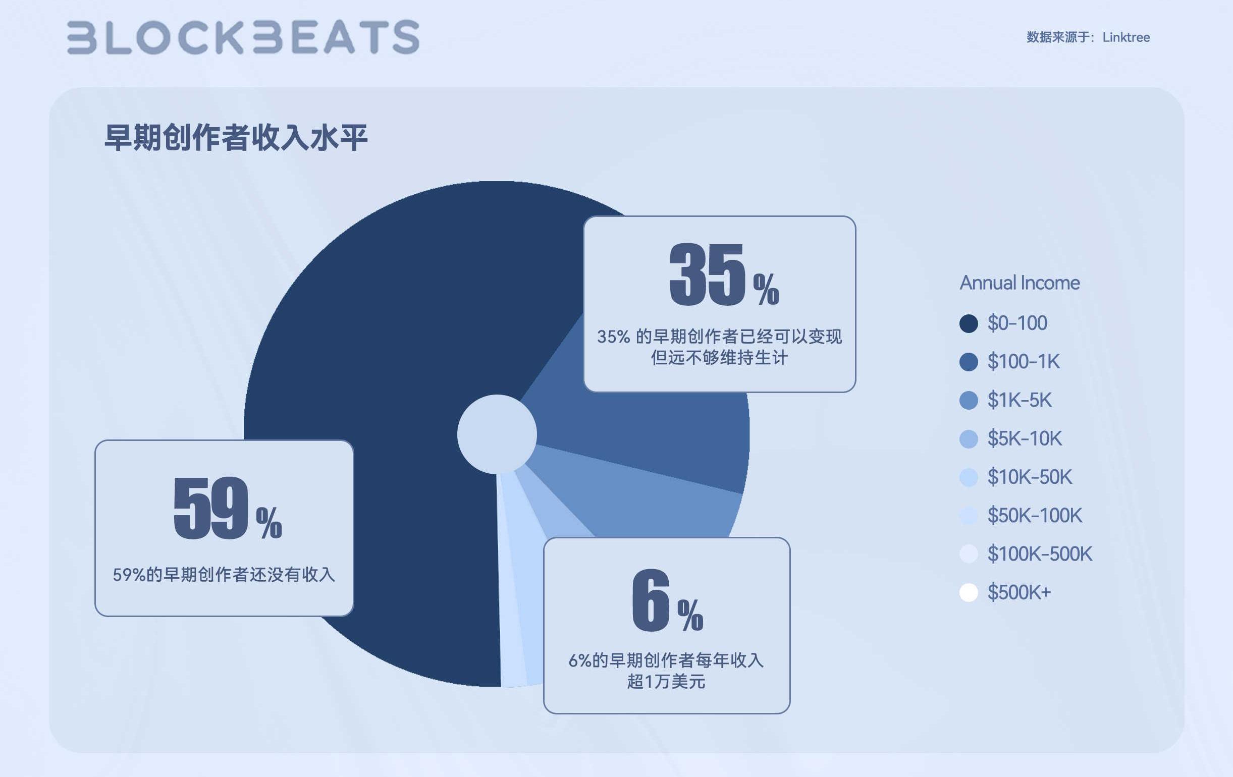 LiJin是前a16z合伙人和VariantFund联合创始人,她也是最早一批专注创作者经济的投资人和实干家,是创作者经济领域的资深专家,其很多观点都对行业从业者有着导向性的作用。在自己的《创作者经济课程》中,LiJin为创作者赋予了三层定义:?创作者以制作以被消费为目的资产,旨在为受众和自己创造价值。?创作者是产生于数字化、民主化媒介传播渠道的影响力人士。?创作者是「数字邪教领袖」。在LiJin等人看来,不同阶段的创作者都有着不同的定义。其实关于「什么是创作者」这个问题,人们始终没有一个标准的定义,但无论是什么类型的创作者,有一些共同的特征。创作者强调个体,多为个体创业,且希望能绕过应用门户,直接面向自己的内容消费者。当前阶段,互联网内容创作者主要通过社交媒体等平台分发自己创作的内容,积累粉丝,并通过品牌赞助、广告分成、付费订阅等模式获得收益。伴随Facebook、Twitter等社交媒体,以及Youtube、Spotify等流媒体平台的发展,「创作者经济」也逐渐成为当今社会的一大主流经济模式。但随着创作者经济的火热,相关的研究报告也不断进入公众视野,透视创作者经济的方方面面,我们也逐渐了解到当前创作者经济面临的诸多挑战。根据Linktree报告数据,66%的创作者将在线内容创作视为副业,36%的创作者内容制作时长不到一年。而在这些早期创作者中,仅有6%收入超过10,000美元,35%的创作者获得的收入不足以维持生计,另外59%的人则完全没有实现内容变现。