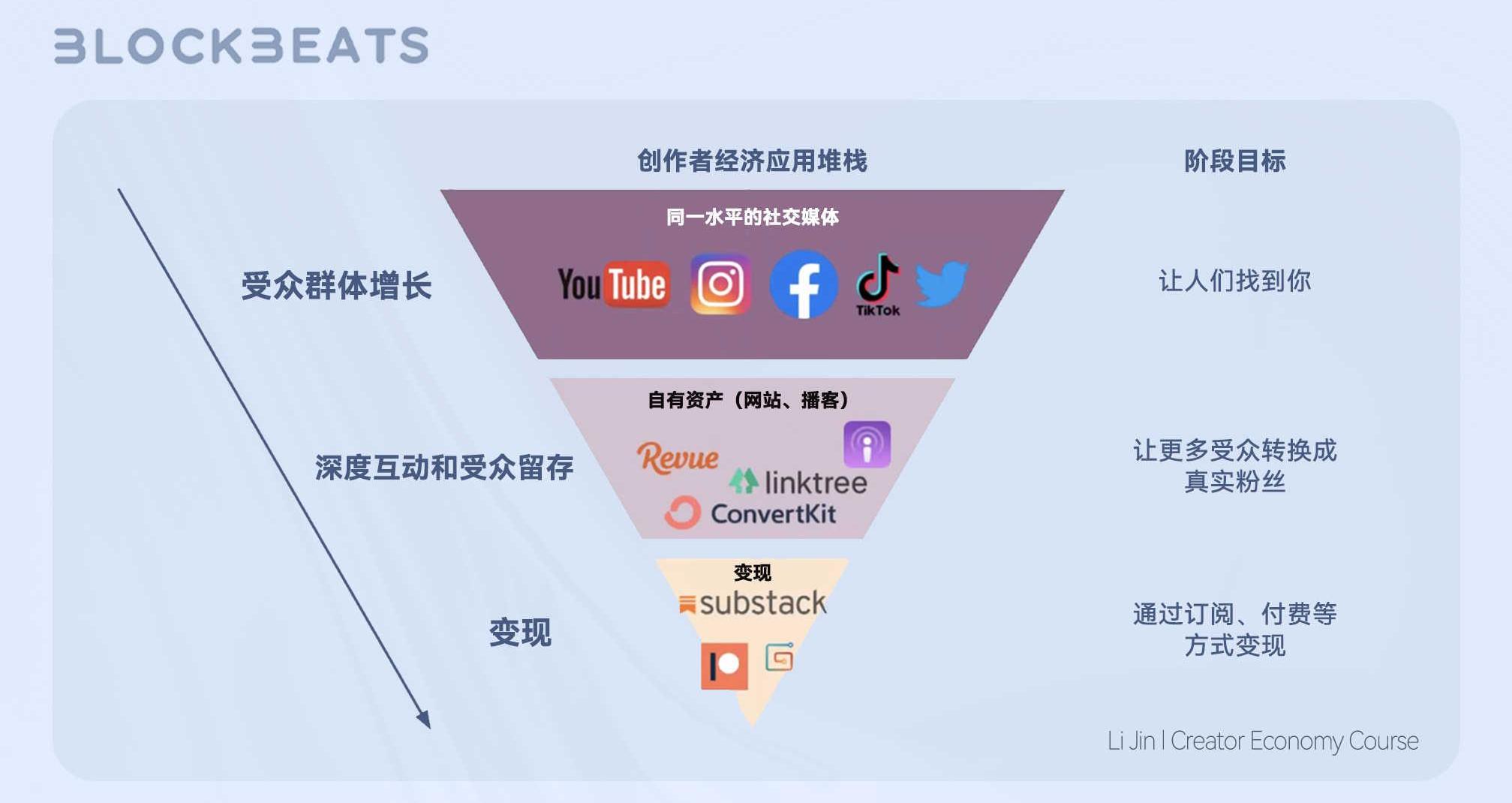 而像Youtube、Spotify这样的垄断型流媒体平台,则会根据内容流量向自己的创作者分配平台广告收入,我们也常听到Youtube创作者年收入数百万美元的消息。但是,这些平台的流量收入绝大多数都分配给了平台前1%的创作者。这种按内容流量,而非互动热度来判定收入分配的模式,使得大部分拥有小规模粉丝群体的创作者很难在这些大平台获得可观收益。因此创作者经济市场也针对这些创作者开发了受众留存和转移的相关应用场景。创作者经济从一开始便是搭建在互联网社交的基础之上。在Web1.0时代是通过电子邮件、RSS等通讯技术进行订阅,Facebook、Twitter等应用诞生后,社交媒体平台就成了创作者吸引、留存受众的第一条战线。LiJin按照「创作者生命周期」(CreatorLifeCycle),将创作者经济应用分为三个模块:?受众获取与增长,这是创作者寻找市场匹配度的过程(CMF)。这类应用以社交媒体平台为主,如Facebook、Twitter等;近年又发展出一些短视频流媒体平台,如TikTok等。当然,像Youtube这样的老牌中场视频平台也包括在内。?增强互动与受众留存,这是创作者培养真实粉丝的过程。这类应用多为门户导航工具,如Linktree、ConvertKit等,以及能与受众产生更深层互动的媒介应用,如ApplePodcast、小宇宙等播客平台。?内容变现,这是创作者建立商业模式的过程。这类应用有着明确的商业模式,创作者可以根据自己的创作形式,引导真实粉丝在这些平台实现内容变现,如Substack、Onlyfans等。