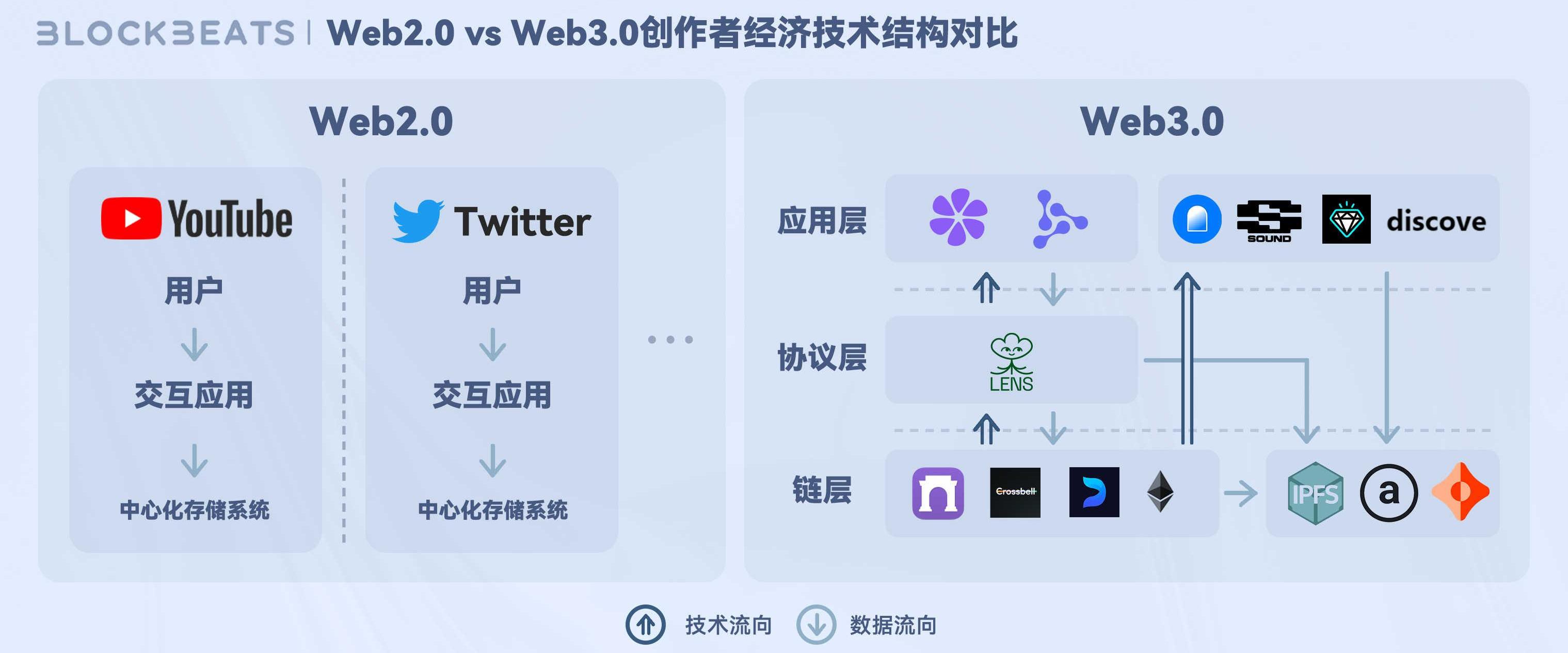 随着TikTok、Instagram等降低创作难度的短视频流媒体平台,以及微信公众号、Substack、Onlyfans等受众留存及内容变现平台的兴起,创作者经济再一次有了活力。2021年,Spotify创始人DanielEk在第四季度财报会议上,甚至直言要在未来大力发展Spotify平台的创作者经济。也是在同一年,以「让社交媒体去中心化」为口号的SocialFi赛道逐渐兴起。SocialFi的核心概念,是在用户掌握数据所有权的前提下,为用户搭建起跨平台、可组合的社交关系网络,并在互动过程中为创作者和受众提供经济补偿和激励。它主张去除中心化平台间的数据壁垒,帮助创作者更好的实现受众留存与内容变现。当然,想要实现这个愿景,就需要一套与Web2.0完全不同的技术结构。在Web2.0语境下,从数据存储再到用户交互均由应用进行独立的管控,行业呈现出点状布局。Web3.0则基于可组合性实现技术堆栈,从而呈现出更加立体的带状布局。目前,Web3.0创作者经济的技术堆栈有三层:?链层,这一层主要包括去中心化存储基础设施,如IPFS、Arweave、ceramic、Livepeer等,以及针对内容社交优化的应用链,如CrossBell、Farcaster、DeSo等,为数据确权提供基础和保障。?协议层,这一层包括基于公链打造的社交协议,如Lens、Orbis等,确保社交关系的所有权和可组合性。?应用层,这一层包括基于协议和应用链打造的内容应用,提供与Web2.0竞争的用户体验。如Mirror、音乐NFT应用等。