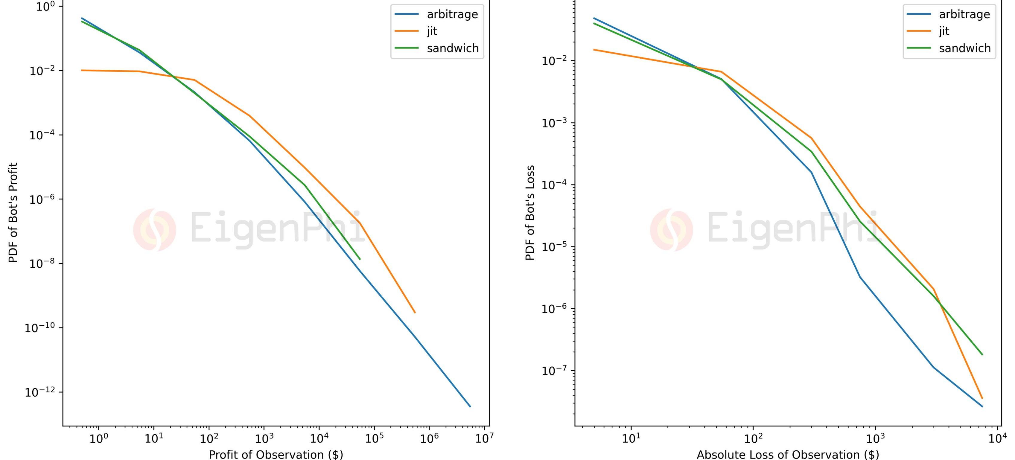 单次观察的盈亏都符合肥尾分布。与套利机器人的盈利能力相比,三明治机器人和JIT机器人遵循相同的分布属性,但它们可以提取的单个观察中的最大利润至少小一个数量级。MEV机器人在一次行动中也会遭受相当大的损失。