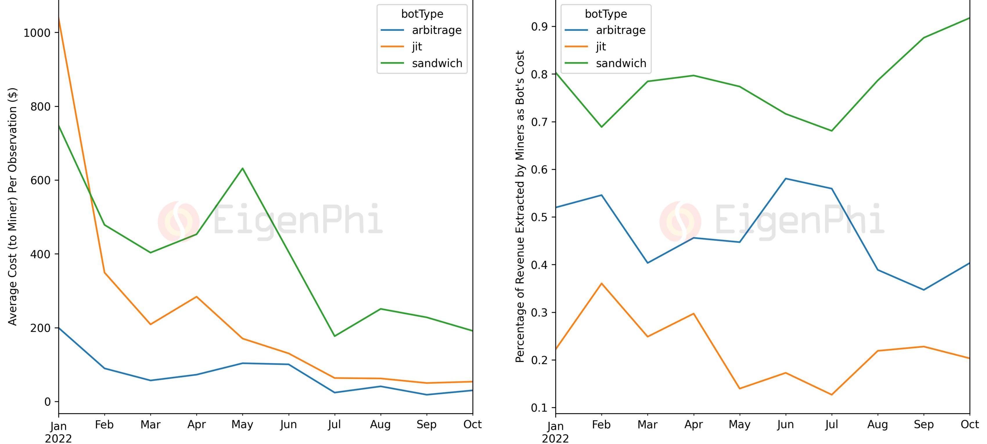 比较不同类型的MEV机器人的收益,我们发现套利机器人比其他类型的机器人可以提取更多的价值。JIT机器人的月收入比其他两种类型小一个数量级,并且尚未呈现出明显的趋势,这也与此类机会刚刚出现有关。