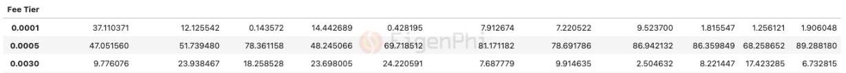 就套利机器人在这些池中的平均活动频率而言,费用等级等于0.0005或0.0001的池更有可能被提取。费用等级为0.0005的池主要受三明治活动的影响。JIT活动也主要发生在费用等级为0.0005的池中。