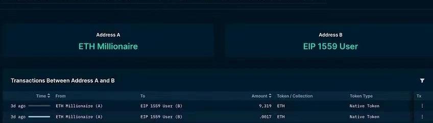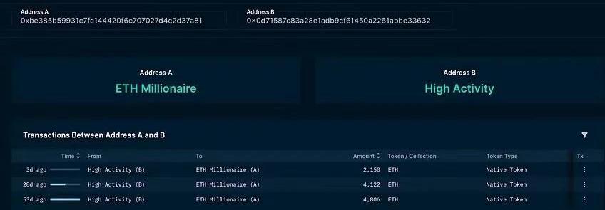 钱包A和钱包B之间的交易。来源:Nansen自创建以来,钱包已经从另一个地址:0x0d71587c83a28e1adb9cf61450a2261abbe33632收到了11008个ETH。