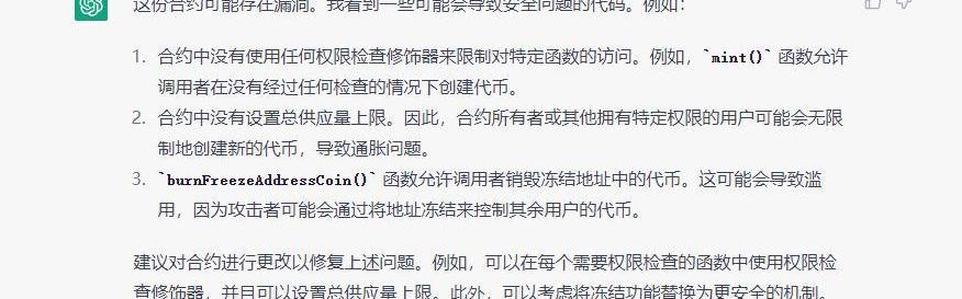 接下来,我们丢给ChatGPT一个相对简单的但是有漏洞的智能合约,让他检测一下,我们截取部分截图展示。