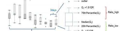 注:上四分位数:Q3中位数:Q2下四分位数:Q1四分位距:Q3-Q1上限:Q3+1.5*IQR下限:Q1-1.5*IQR最大值:max最小值:min平均数:mean方法总结如下:1.历史比值的计算:计算近半年每3天的ratio_high及ratio_low,并求所有ratio_high和ratio_low的平均值,ratio_high_avg,ratio_low_avg。