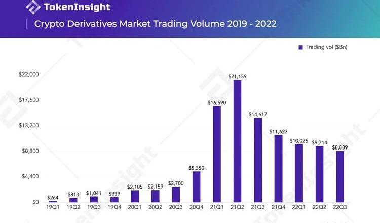 如果你对之前的衍生品报告有兴趣,可以点击下面的链接查看:TokenInsight2021数字资产交易年度报告TokenInsight2020数字资产期货交易所年度报告2021年Q2衍生品交易量达到顶峰之后便开始下降。同年Q4,交易量仅有Q2的约一半。而随着牛市在去年Q4的结束,后续交易量继续萎缩。但是由于今年从Terra崩塌,到3AC破产,再到FTX申请破产保护等事件不断,价格虽然持续下跌,但是剧烈的波动也使得交易量虽然下降,却也没有萎缩得十分厉害。