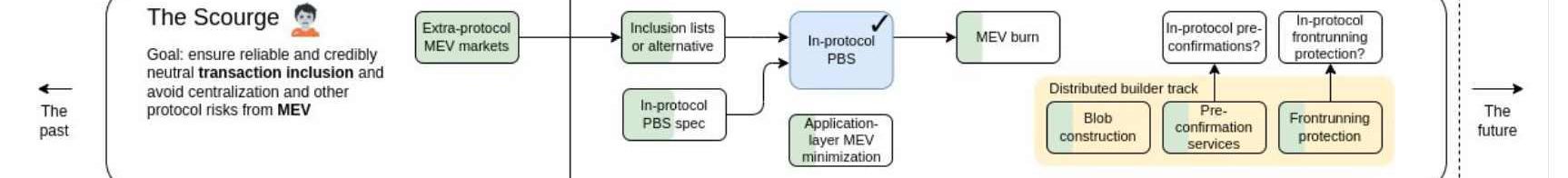 12/30第三阶段Scourge是新加的,上个路线图是没有的!这个小僵尸头像代表了这个阶段是主要针对MEV的,非常欣慰ETH这么重视这一点。MEVisbad。Nansen给我一个地址贴的标签是,重度链上交易者和三明治攻击受害者,我每天交易头都被夹爆了,没有用户喜欢MEV。13/30然而,MEV对于PoS节点却是好个生意。低情商的说法是:PoS节点接入MEV,实际就是在链上「与民争利」。回到路线图,幸好,ETH还是认为交易打包需要中性。目前选出的方案是用PBS来降低MEV的影响。14/30PBS即出块者和排序者分离。排序者只负责排序不管上链,出块者不管交易,直接选排序者打好的包上链。这样贿赂链条就变长了,多少会好一点。但是并不能治本,只能是「缓解」。毕竟PBS只是削弱节点的权力,让报价公开化。15/30另外路线图里留了几个小问题,可能是接下来的研究方向:比如能不能App直接帮你预确认?例如Uni帮你内部预约了交易成功;或者App是否可以公开禁止三明治来保护用户呢?例如Uni禁止三明治机器人。16/30Btw,PBS的工作基本上都只开展了20-40%。只有一个完成了,那就是外部MEV市场,这个估计说的就是flashbot吧。