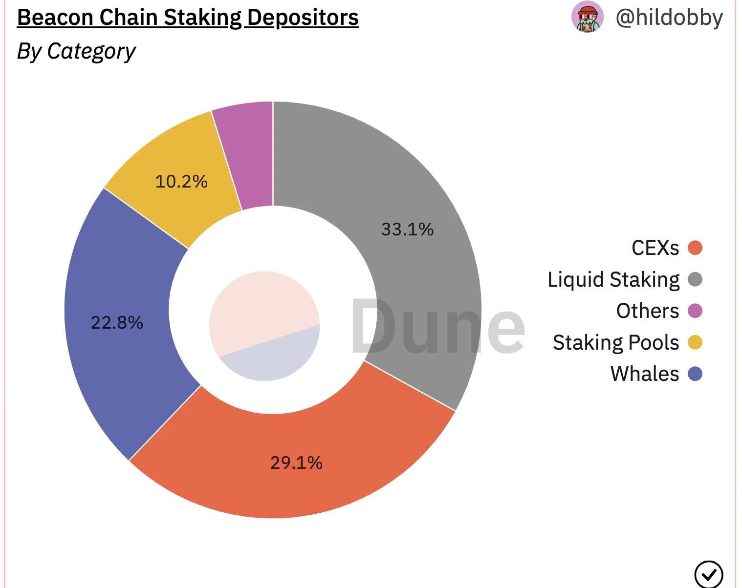 目前来看,质押服务提供商仍是最大的质押来源。Dune数据显示,约三分之一的ETH质押来自质押服务商,而中心化交易所所占份额与其几乎相等,位列第二。此外,巨鲸独立质押的ETH数量也不容小觑,拥有超过五分之一的份额。