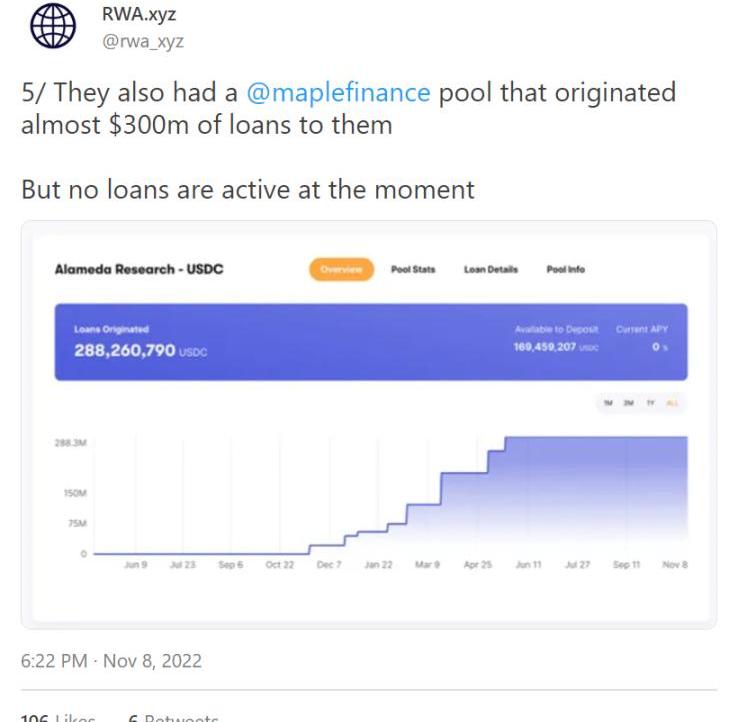 风险:作为贷方,必须相信借贷的实体会偿还贷款。在借出任何大笔款项之前,必须进行彻底的尽职调查。不要盲目相信借款人的还款能力。这是本文中涵盖的风险最高的无抵押贷款类别!如果借款人破产,还款要求将与对实体资产的所有其他要求一样。破产程序,特别是对于自营贸易公司和对冲基金等高度复杂和极其复杂的金融实体而言,通常需要数年时间才能结清,例如Mt.Gox的受托人最近通知债权人在7月份登记还款。如下图所示,Alameda目前在TrueFi上的未偿债务超过1200万美元。该基金的贷方将无法收回债务,而且很可能无法达到5.33%的收益率。虽然目前尚不清楚该流动性池的价值减值情况,但很可能会大幅缩水。