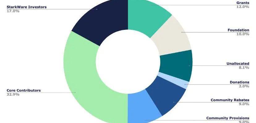 Starkware在今年七月中旬的博客中发布了他们的代币经济模型。原本计划于9月发行其代币,但是后又发布消息推迟发币时间,截至本文发布的时间,仍然没有官宣发币。StarkNet代币将主要具有3个使用场景,分别是支付StarkNet网络费用、质押以参与网络共识、社区治理投票。交易费用:目前,StarkNet中的费用以ETH支付。但接下来,该项目预计费用将仅使用原生StarkNet代币支付。为了支持良好的用户体验,自动化和去中心化的链上机制将允许用户以ETH支付费用。质押:对StarkNet的活跃性和安全性至关重要的某些服务可能需要质押StarkNet代币。这些服务可能包括排序、在达到L1最终性之前达成临时L2共识、STARK证明服务和数据可用性供应。预计这些服务将在2023年实现去中心化。治理:改进StarkNet的提案将需要一个最低的代币持有阈值。对于对StarkNet的活跃性、安全性和维护至关重要的协议的所有更改,都需要直接或通过委托进行投票。例如,StarkNet操作系统的所有重大更新都需要获得代币持有者的批准。StarkNet代币初始发行量为100亿枚,17%?分配给StarkWare投资者,32.9%分配给核心贡献者,50.1%分配给基金会。同时,该代币具有增发机制,新的铸造代币和交易费用的一部分将授予给核心基础设施开发人员和智能合约开发人员。