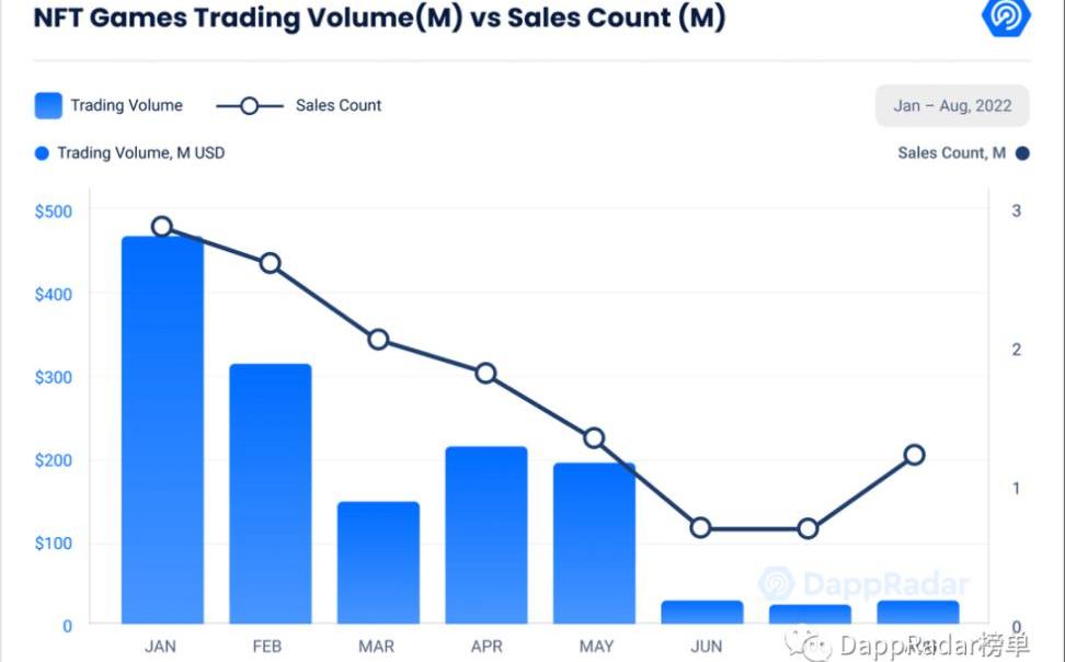 在8月份,AlienWorlds是玩得最多的区块链游戏,日均UAW为197,555,比前一个月下降了4%。他们宣布与Zilliqa合作,通过Unity软件开发工具包将AlienWorlds整合到他们的平台中。如果想了解更多关于此合作关系及其未来计划的信息,请观看我们在DappDays期间制作的最新AMA。Gameta是一款基于solana的游戏,于8月27日在BNB链上推出,自7月以来其日均独立活跃钱包数增加了33%,在BNB链去中心化应用(dapps)中用户数量排名第二,在GameFi项目中排名第一。AxieInfinity已将其链上玩家群巩固至每日3.6万的水平。本月,该游戏的NFT系列的销售额为42.4亿美元,其次是CryptoPunks的29.2亿美元。8月11日,他们宣布开始OriginSeason0,标志着其过渡到第三阶段。随着这个新阶段的到来,奖励系统将被改变,SLP将被移除。