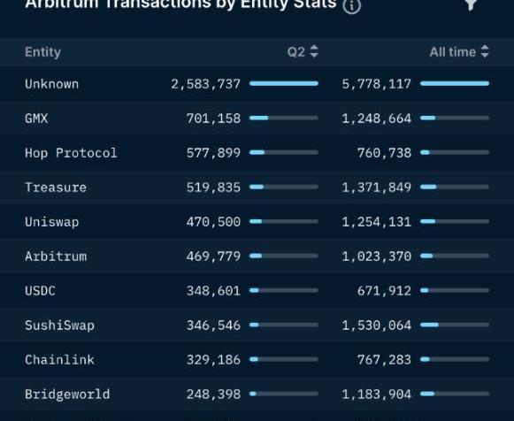 除了SmartMoney,我们还可以使用Nansen标签来根据Arbitrum上的用户数量和交易数量来分析正在与之交互的顶级项目方。此处显示的许多项目方都是ArbitrumOdyssey的一部分,并且可能表明该活动在引导用户与Arbitrum生态系统中提供的dApp进行交互方面的有效性。除了Swap交易和跨链桥之外,GMX和Treasure作为有趣的项目脱颖而出,为Arbitrum的交易量做出了贡献。最后,顶部列出的「未知」是指所有未标记实体的总和,而不是单个未知项目方。Arbitrum上知名项目方