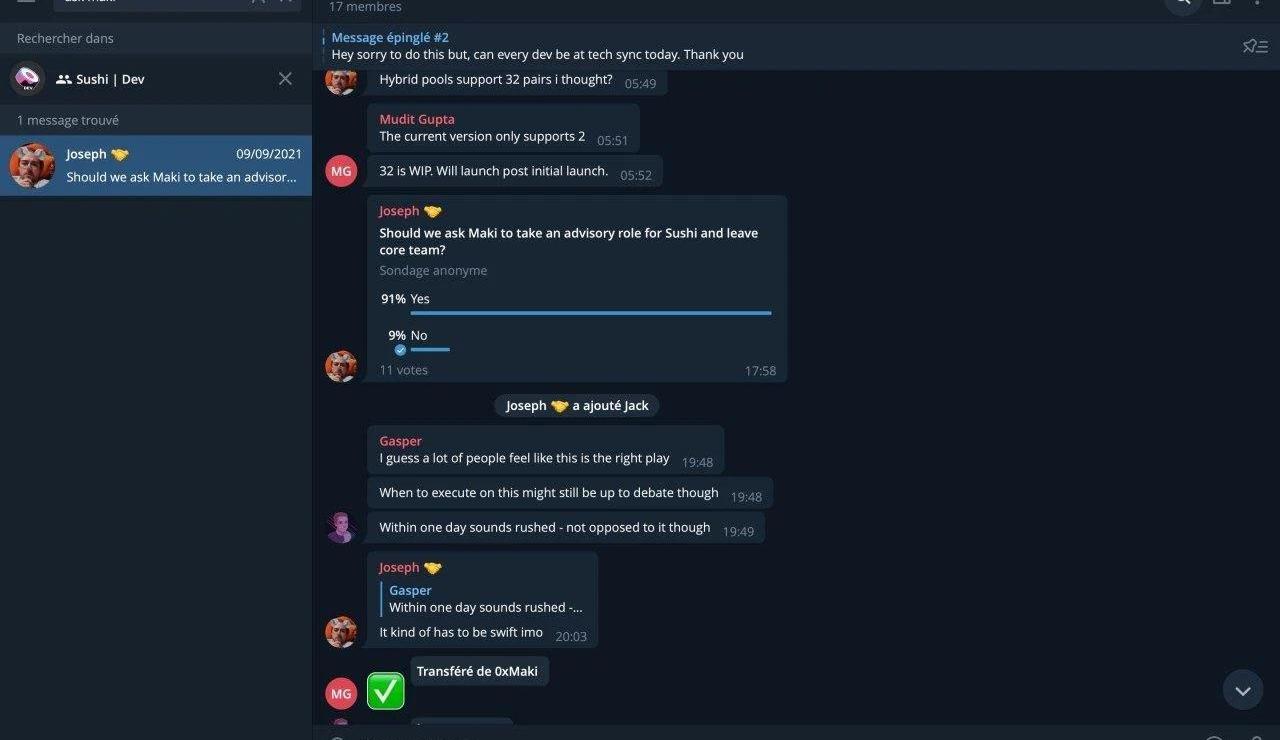 Nomi离开之后,群龙无首的SushiSwap社区决定再聘请一位新的“主厨”。随后,多签管理人之一、CinneamhainVenutres合伙人AdamCochran提议由0xMaki来担任这一职位。虽然社区在薪水设置上有过短暂分歧,但这一提案最终还是顺利走通了治理程序,0xMaki上任。客观来说,0xMaki对于SushiSwap的领导绝对是成功的。SushiSwap随即也迎来了自身发展的“黄金时刻”,锁仓资金总额稳步上升,币价也创下新高,逐步坐稳了DeFi龙头的一席。通过主打“社区驱动”这一亮点,SushiSwap与“VC驱动”的Uniswap在品牌层面形成了鲜明的差异化,一时之间甚至呈现出分庭抗礼的态势。不过好景不长,2021年9月,0xMaki突然宣布辞去“主厨”一职,转而作为顾问继续为SushiSwap服务。虽然0xMaki表示辞职只是个人原因,但蛛丝马迹显示事实似乎并非如此。事情发生后不久,SushiSwap亚太地区负责人AG在社交媒体上公开声讨SushiSwap管理层,并透露0xMaki是被RachelChu等核心团队成员刻意排挤出了项目。除此之外,一张疑似为内部投票截图的图片信息也显示,0xMaki的离职似乎是由首席技术官JosephDelong等11人集体投票做出的决定。